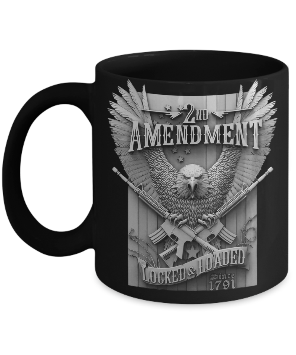 "2nd Amendment Locked and Loaded". Whether you're drinking your morning coffee, evening tea, or something in between—this mug's for you! It is also a perfect gift for the gun lover in your life! It's sturdy and glossy with a vivid print that'll withstand the microwave and dishwasher, and comes in 11 oz or 15 oz sizes.